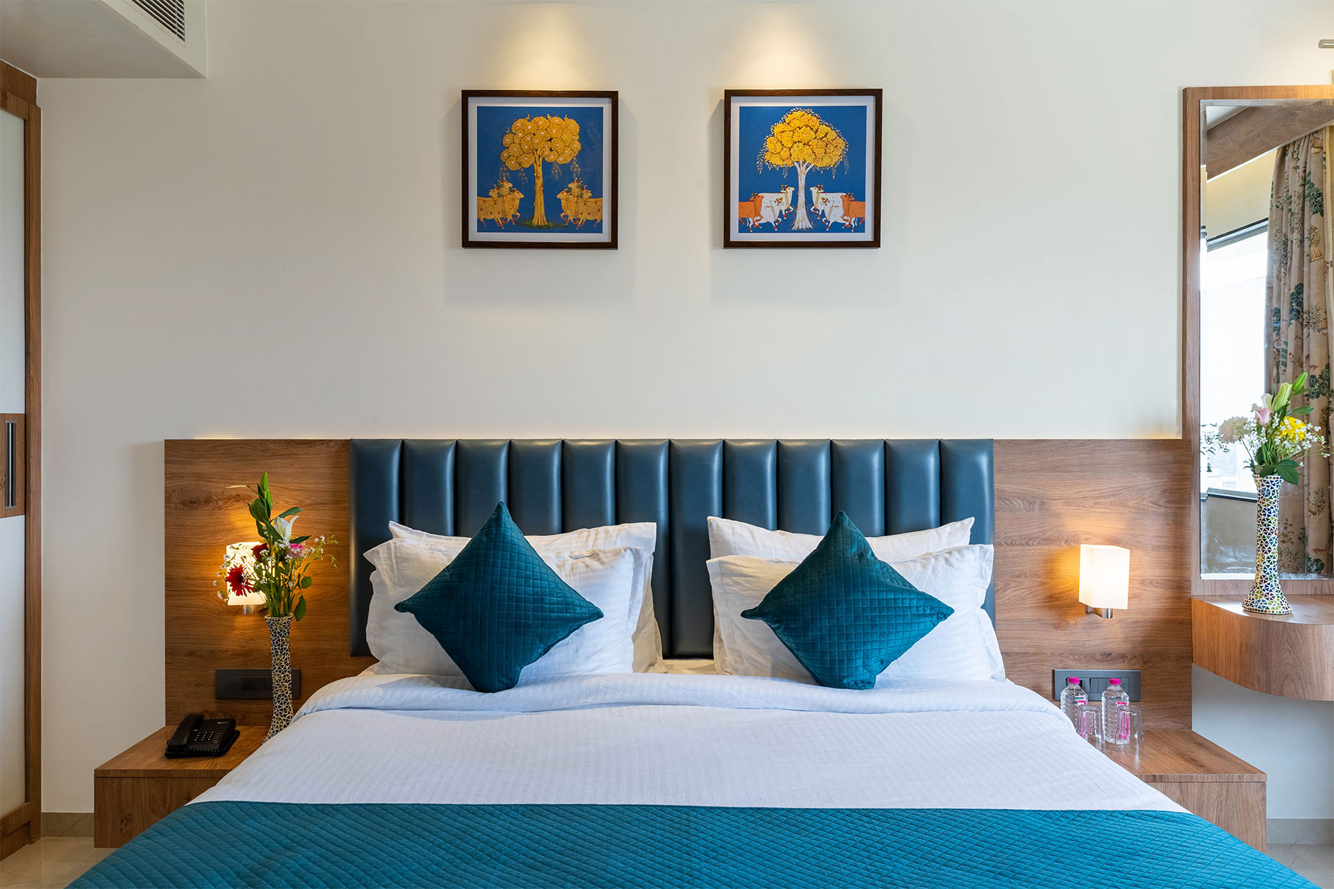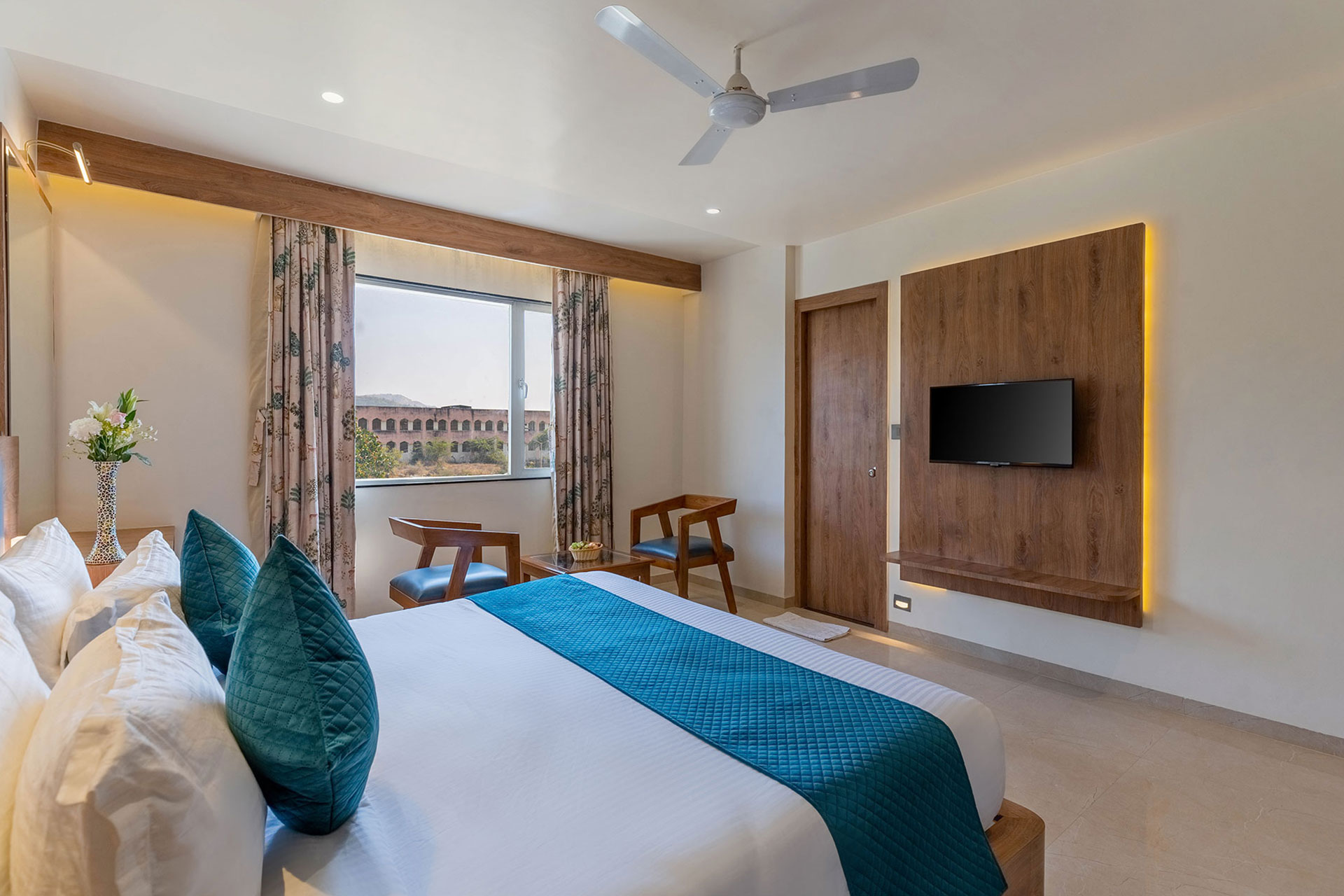Our 16 Deluxe rooms in Udaipur, are modern decorated, can accommodate up to 2 persons, are totally soundproofed, and equipped with high-tech comforts such as high-speed internet access, USB ports, smart TV, room cleaning, etc. The 250 sq. ft room offers a comfortable stay in Udaipur for guests arriving for leisure and business trip in Udaipur.